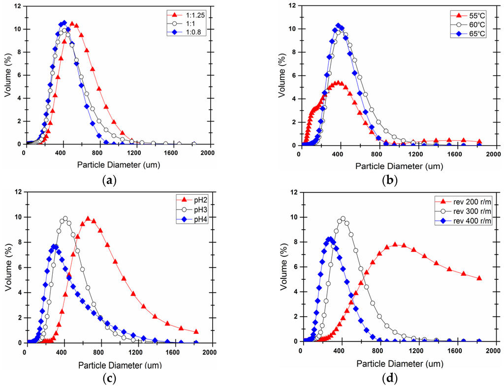 Figure 8b shows the effects of temperature on the size distribution. The microcapsules become in a wider spread range of size at 55 °C when compared with that of the other two temperatures. The volume at the peak size, i.e., about 400 µm, decreases half at 55 °C while it follows the quite similar distribution for 60 °C and 65 °C. At lower temperature, the reaction is not competitive and therefore the UF resin cross-linking reactions are slowand so is the particle formation rate. This results in a reduced ability of the shell to encapsulate the core materials. The size shifted slightly to the smaller ones when the temperature increased to 65 °C from 60 °C because the particles formed rapidly at a higher temperature. Under these conditions, the capsule shell is comparatively thin. The relatively large size of the capsule can be prone to rupture under the high shearing forces caused by stirring. However, the probability of collisions between the particles increases at high temperatures and this prevents the particles from depositing and adhering onto the core particles.