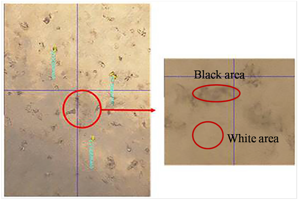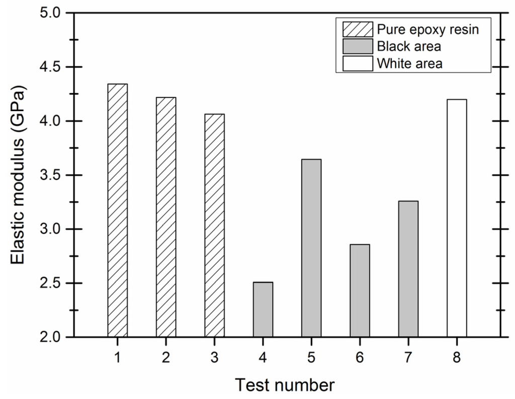 To find the appropriate testing zone for the properties of the microcapsules, a pure epoxy resin sample was prepared as calibration. The white and black areas of the microcapsules embedded sample were both tested as shown in Figure 9.