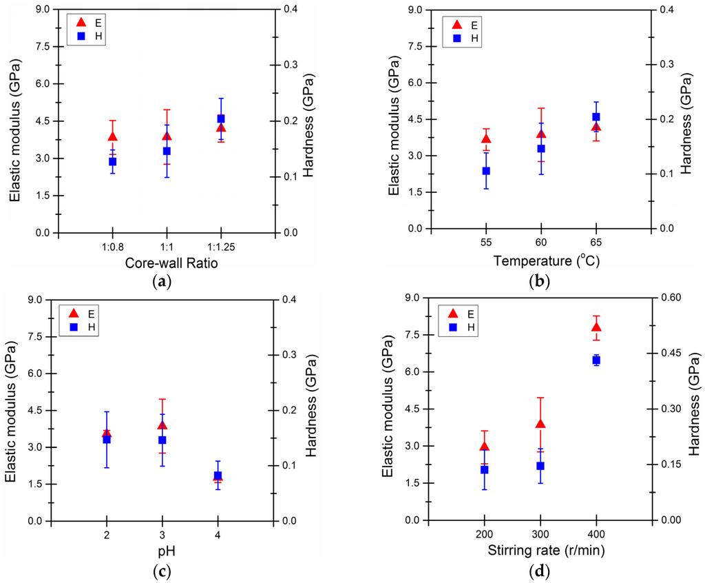 Effect of (a) core-wall ratio; (b) reaction temperature; (c) pH value and (d) stirring rate on elastic modulus (‘E’) and hardness of microcapsules (“H”).