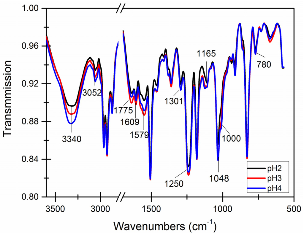 Figure 12 shows decreases in the bond peak (3340 cm−1) as the pH decreased; this may indicate that low pH aids in the formation of bonds. Decreases in the N-H bond peak (1000 cm−1) were more obvious and was only observed when the pH was 4. A large number of bonds (1250 cm−1 and 1084 cm−1) formed, which can further react to the form the wall.