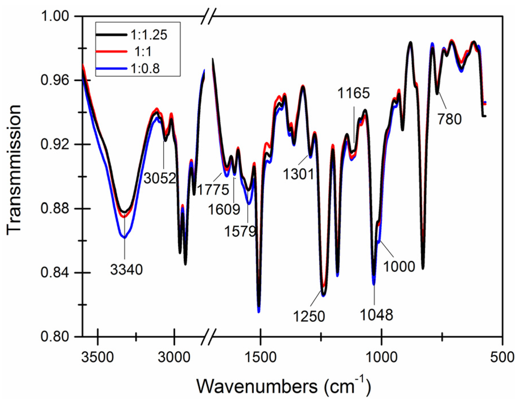 A brief literature review [52] indicates the main characteristic infrared spectra peaks of epoxy resin E-51 are 771 cm−1, 1035 cm−1, 1184 cm−1, 1361 cm−1 and 1583 cm−1–774 cm−1. In the reaction of formaldehyde and urea, the number of hydroxyl and amino groups gradually decreased, and the absorption peaks of 3330 cm−1 and 1000 cm−1 decreased.