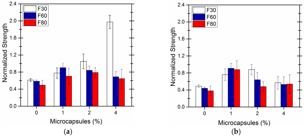 The strength restoration of the sample with 1 wt % of microcapsules was more obvious than that of 2 wt % and 4 wt %. Concerning the effect of pre-damage on the strength restoration rate, 30%fmax led to the best strength recovery for the microcapsules prepared in optimized parameters since it passed a critical combination of a high enough stress to active cracks healing but not too high to induce extra cracks that cannot be healed by the limited available adhesive. The one with a core-wall ratio of 1:1.25 does not show a clear trend of the strength recovery with an increase of load applied.