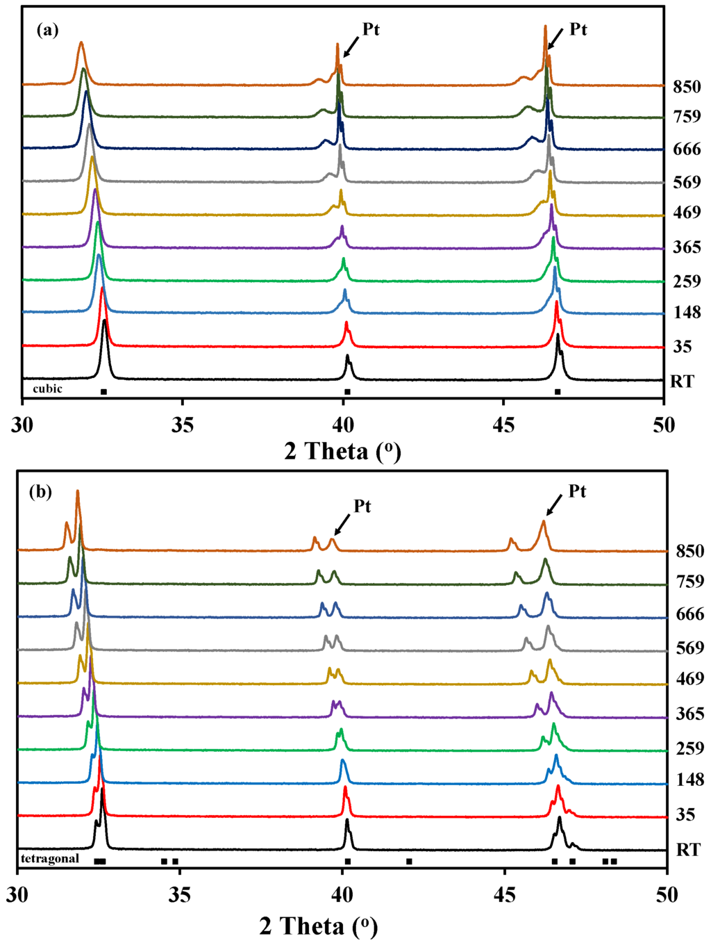 High temperature X-ray diffraction patterns measured in pure O2 from room temperature to 850 °C for:(a) A-site cation disordered La0.5Ba0.5CoO3-δ; and (b) A-site cation order and oxygen vacancy disordered LaBaCo2O5+δ. The Bragg reflections for both cubic and tetragonal cells are included at the bottom.