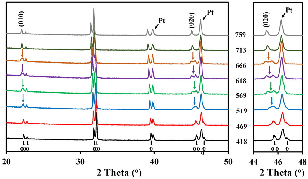The high temperature X-ray diffraction data collected for LaBaCo2O5+δ in N2 are shown in Figure 3. A shift of the Bragg reflection to lower 2θ was also observed due to both thermal and chemical expansion, but in addition two phase transitions were observed during heating in N2. A change to a lower symmetry was observed between 450 °C and 675 °C due to the splitting of the (010), (012) and (020) reflections, as marked with an arrow for (010) and (020) in Figure 3. In this range of temperatures, the XRD patterns can be indexed to an ap × 2 ap × 2 ap orthorhombic space group Pmmm previously shown by Rautama et al. [15] for LaBaCo2O5.5, which takes into account the ordering of the oxygen vacancies in addition to A-site cation ordering.
