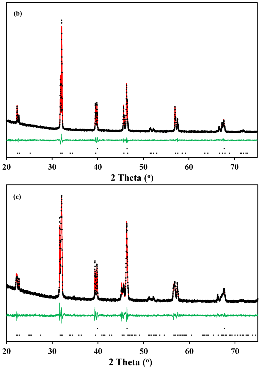 Typical Rietveld refinements of the X-ray diffraction patterns of La0.5Ba0.5CoO3-δ and LaBaCo2O6-δ materials at 600 °C in O2 and N2 are shown in Figure 4. The Rietveld refinement analysis confirms the cubic (Figure 4a), tetragonal (Figure 4b) and orthorhombic (Figure 4c) crystal structures at both room and high temperature, as suggested above. The crystallographic data determined by the refinements are summarized in Table 1.