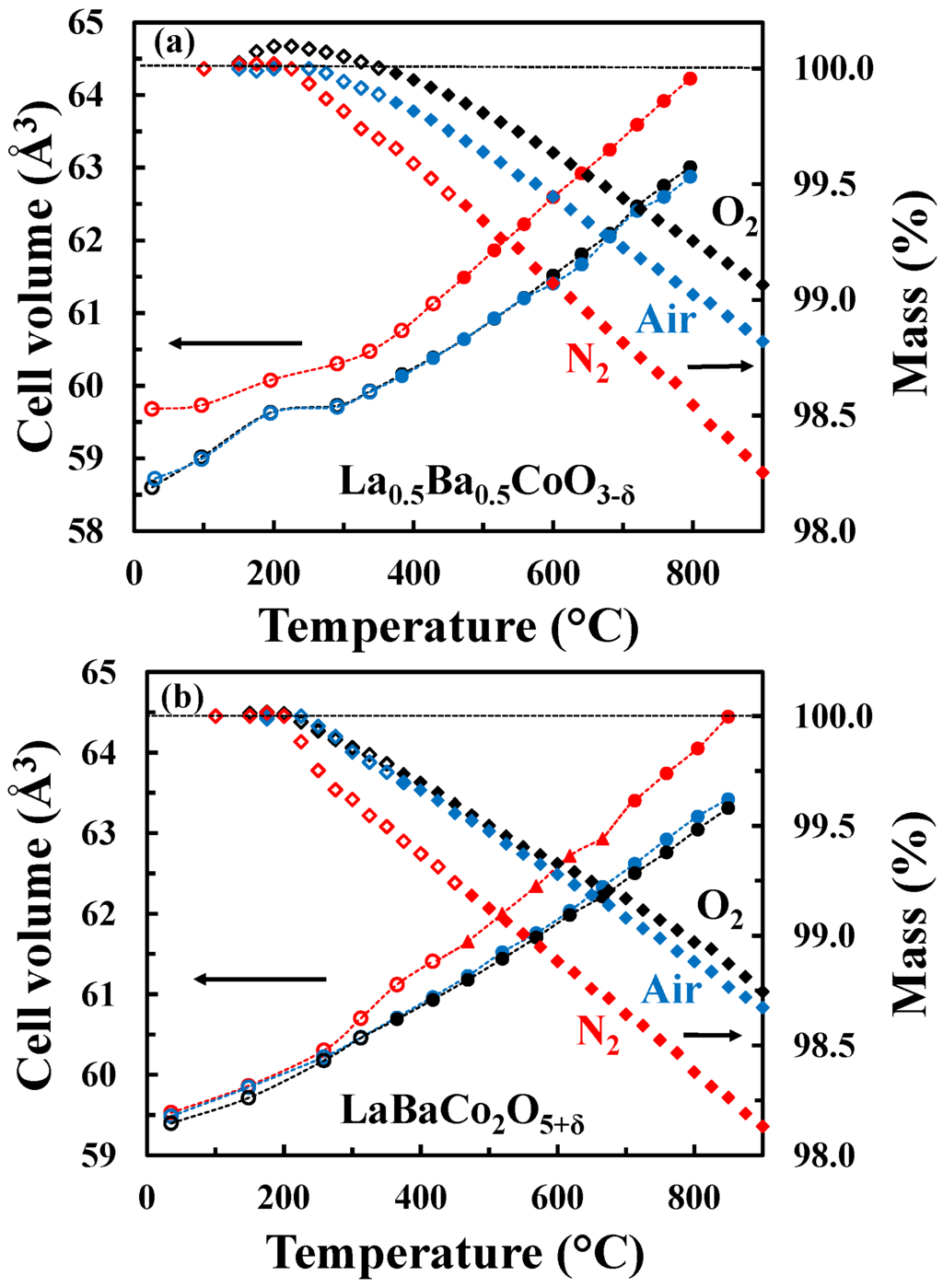 Unit cell volume (circles for tetragonal polymorph and triangles for orthorhombic polymorph) and relative mass change (diamonds) of (a) La0.5Ba0.5CoO3-δ and (b) LaBaCo2O5+δ as a function of temperature in O2 (black symbols), air (blue symbols) and N2 (red symbols). Open symbols represent data out of thermodynamic equilibrium. The dotted lines are guides to the eye.