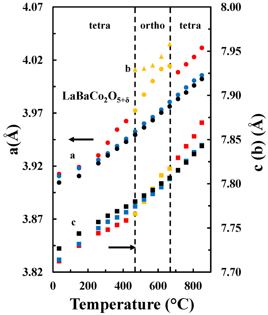 - Tsvetkov, D.S.; Ivanov, I.L.; Malyshkin, D.A.; Zuev, A.Y. Oxygen content, crystal structure and chemical expansion of PrBaCo2-xFexO6-δ double perovskites. Dalton Trans. 2014, 43, 11862–11866. [Google Scholar] [CrossRef] [PubMed]