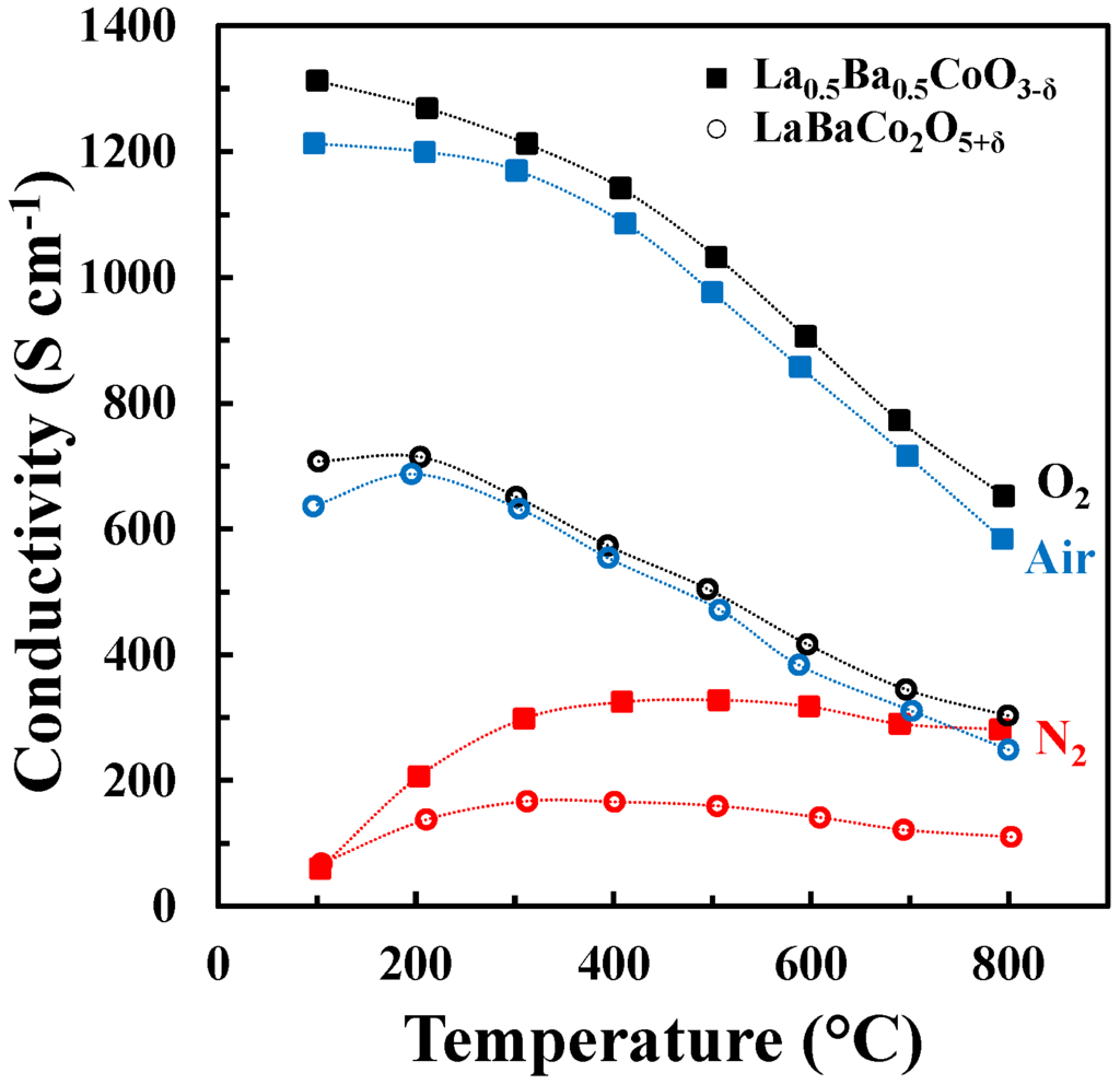 The DC conductivity of La0.5Ba0.5CoO3-δ and LaBaCo2O5+δ as a function of temperature in N2, air and O2 is shown in Figure 7. Both materials have a high electronic conductivity (~1000 and 500 S cm−1 at 500 °C for La0.5Ba0.5CoO3-δ and LaBaCo2O5+δ, respectively) in air and O2. The conductivity decreases with increasing temperature, pointing to a metallic behavior, at least at low temperature where thermal reduction will not contribute. The conductivities remain high (~300 and 175 S cm−1 at 500 °C for La0.5Ba0.5CoO3-δ and LaBaCo2O5+δ, respectively) in N2. In this case, the conductivity increases with temperature at lower temperatures (100 °C–400 °C) and is nearly constant at higher temperatures. In addition, the layered perovskite shows nearly half of the conductivity relative to the cubic perovskite, which demonstrate that the A-site cation ordering is not beneficial for the overall electronic conductivity.