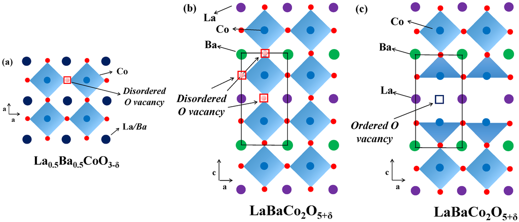 In addition to cation ordering, oxygen deficiency at elevated temperatures may also lead to ordering of oxygen vacancies, e.g., for LaBaCo2O5+δ [15], PrBaCo2O5+δ [16] or GdBaCo2O5+δ an orthorhombic structure with space group Pmmm (ap × 2 ap × 2 ap) is adopted when the oxygen vacancies reaches a certain level dependent on the type of lanthanide and transition metals [13]. The oxygen vacancies are located in the LnO layer of the double perovskite structure in order to compensate for the size difference between Ln and Ba [5,15,17,18,19]. In contrast to A-site cation ordering, the oxygen vacancy ordering is not beneficial for oxide-ion conduction [20,21]. A specific notation is introduced to highlight the presence of oxygen vacancies. Chemical formula is commonly written as LaBaCo2O5+δ instead of LaBaCo2O6-δ in order to emphasize this high oxygen content deficiency and it does not have to be mixed with the brownmillerite notation [22].
