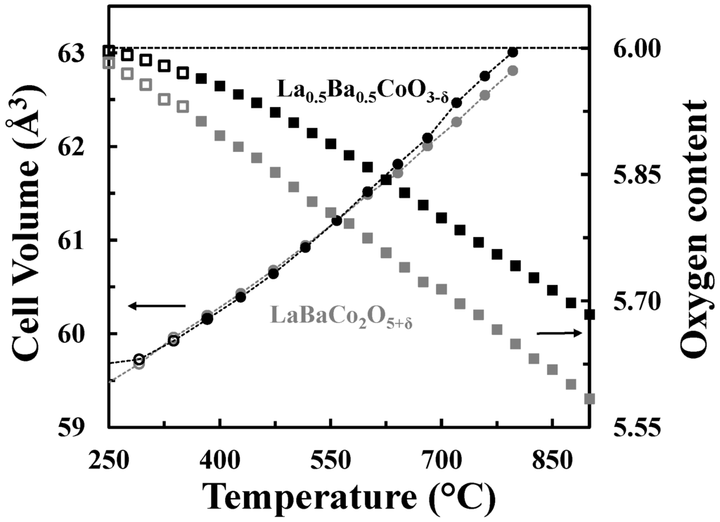 The A-site cation ordered structure can accommodate oxygen vacancies without extensive chemical expansion as shown in Figure 9, where the cell volumes and the oxygen contents vs. temperature in O2 for both La0.5Ba0.5CoO3-δ and LaBaCo2O5+δ materials are represented. The unit cell volumes of the two materials are quite similar despite the difference in oxygen deficiency.