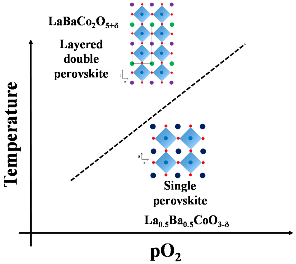 Schematic stability diagram for La0.5Ba0.5CoO3-δ and LaBaCo2O5-δ as a function of temperature and pO2.
