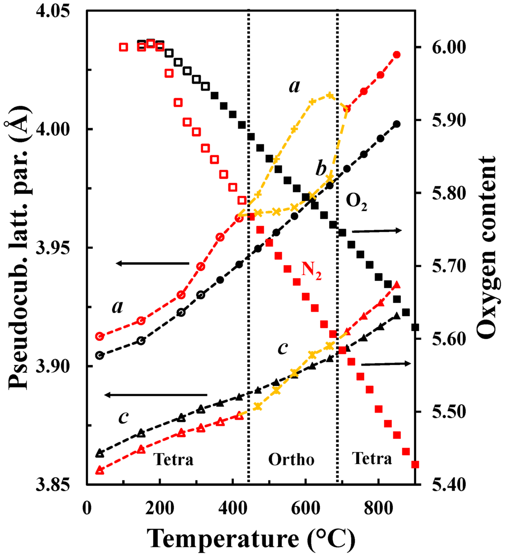 As it was discussed in the previous section, the pseudocubic lattice parameters and the oxygen content of LaBaCo2O5+δ as a function of temperature in both O2 and N2 are shown in Figure 11. The corresponding change in the oxygen deficiency is also included in the figure. An anisotropic chemical expansion evolves at the onset of thermal reduction. The thermal reduction occurs at temperatures as low as 250 °C. Chemical expansion coefficient can be estimated from the combination of the unit cell parameters and the oxygen non-stoichiometry. The effect of chemical expansion of the lattice parameter a can be expressed through the chemical strain where ao is the lattice parameter in pure O2 and a is the corresponding value in for example N2. Correspondingly the normalized chemical strain [42] can be defined as where Δδ is the difference in oxygen non-stoichiometry by the change in atmosphere at constant temperature. The chemical strain calculated from the data in Figure 11 are summarized in Table 3. The chemical strain is relatively independent on temperature for both La0.5Ba0.5CoO3-δ and LaBaCo2O5+δ. The chemical expansion of La0.5Ba0.5CoO3-δ is larger than for the A-site cation ordered LaBaCo2O5+δ as it can be seen for the cell volume values in Table 3. In addition, the chemical expansion of the A-site cation ordered LaBaCo2O5+δ is anisotropic. The chemical expansion of LaBaCo2O5+δ in the a direction is larger than in the c direction but comparable with the chemical expansion of La0.5Ba0.5CoO3-δ in the a direction. Therefore, this anisotropy could be at the origin of the reduction of the chemical expansion for the A-site cation ordered LaBaCo2O5+δ material.