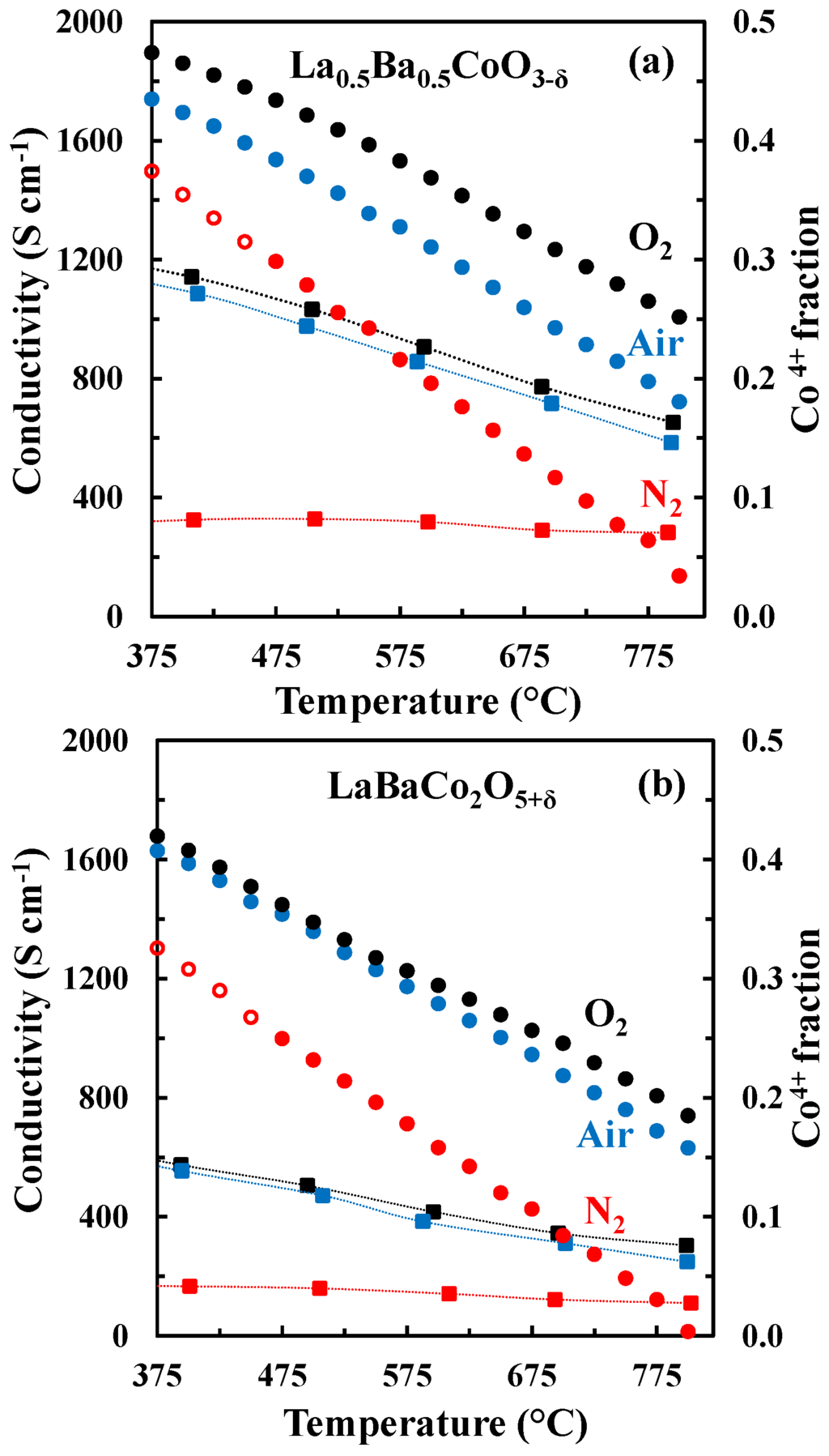 Electrical conductivity (squares) and Co4+ fraction (circles) vs. temperature for La0.5Ba0.5CoO3-δ (a) and LaBaCo2O5+δ (b) in O2, air and N2. The open symbols are data out of the equilibrium. The dotted lines are guides to the eye.