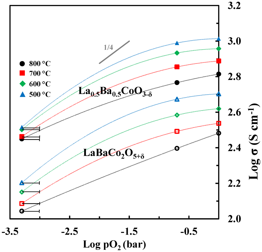 At temperatures below ~400 °C, the electrical conductivity of La0.5Ba0.5CoO3-δ and LaBaCo2O5+δ is decreasing with temperature and the materials show a metallic type behavior (Figure 7). Above this temperature region, the electric conductivity of La0.5Ba0.5CoO3-δ and LaBaCo2O5+δ is consistent with previous reports on p-type semiconductor behavior [32,33,34]. Assuming LaCoO3 as the host material, substitution of Ba into LaCoO3 can be described by defect equilibrium (2), using Kröger–Vink notation [33]:
