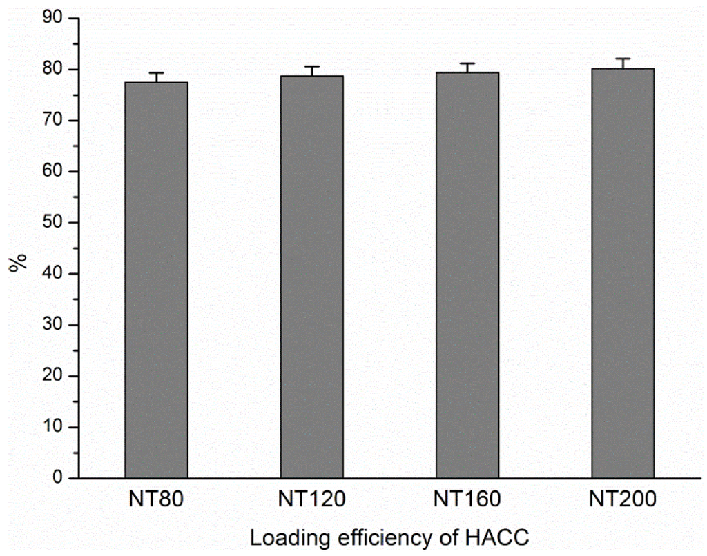 As described above, HACC was loaded into nanotubes using a lyophilization method and vacuum drying in this study, and the nanotubes were filled with 2 mg of HACC. The loading efficiency of HACC in the nanotubes was evaluated prior to the HACC release assay. The concentrations of the rinse solutions were measured by the previously described anthrone sulfuric acid reaction. The loading efficiency was calculated from the formula η = (mo – mr)/mo, where η is the loading efficiency, mo is the amount of HACC loaded in the nanotubes (2 mg), and mr is the amount of HACC in the rinse solution. Figure 1 shows the loading efficiencies of different diameter NT-H. The results indicate that approximately 75%–80% of HACC is retained in the nanotubes after the initial wash. No statistically significant difference was found among the four different diameter NT-H (P > 0.05).
