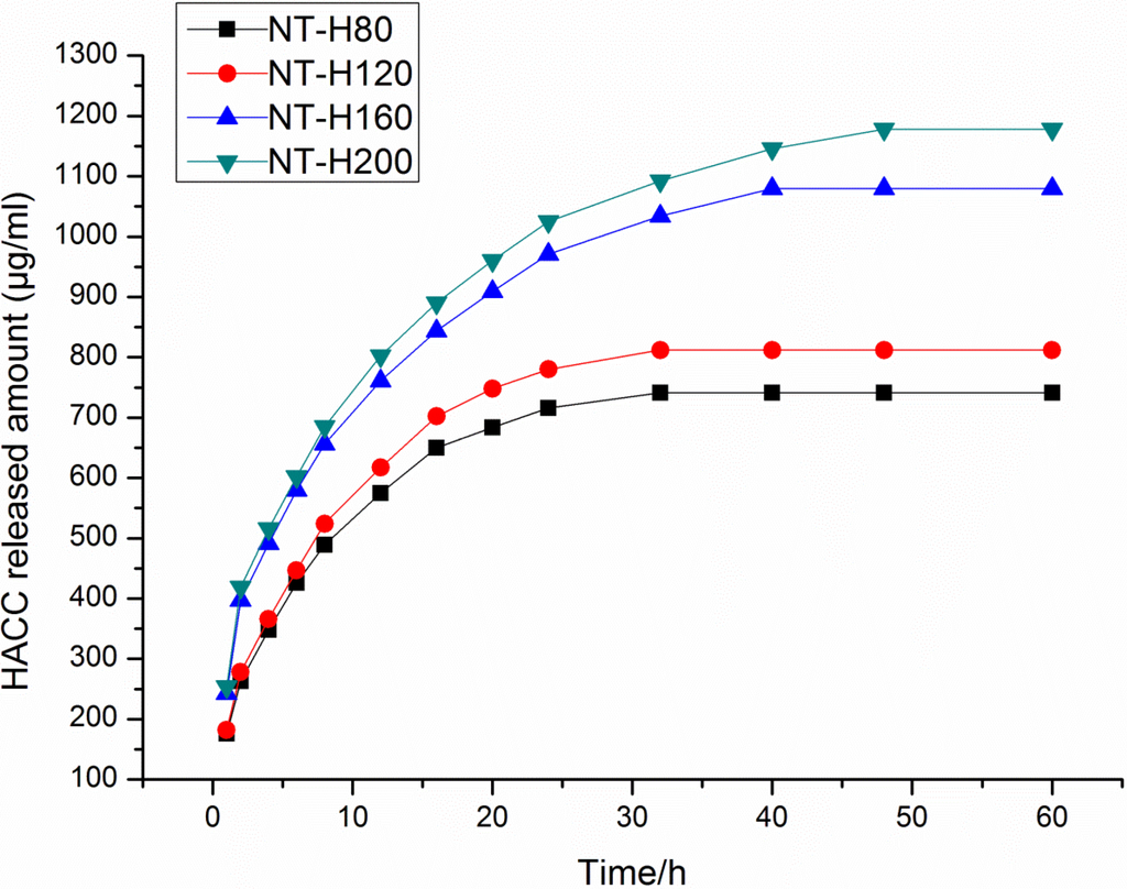 Figure 2 shows that HACC release from different diameter nanotubes, which is expressed in µg/mL. There is higher sustained HACC release from the nanotubes with larger diameters (160 nm or 200 nm) than from those with smaller diameters (80 nm or 120 nm). The majority of HACC was released from NT-H160 and NT-H200 after approximately 24 h and from NT-H80 and NT-H120 after approximately 12 h. We observed that HACC release from NT-H could be divided into two parts: initial burst release and relatively slow release. After a high initial release, the amount of HACC eluted from the nanotubes remained nearly constant. As shown in Table 1, the total release of HACC from NT-H80, NT-H120, NT-H160, and NT-H200 was 741, 812, 1080, and 1178 µg, respectively.