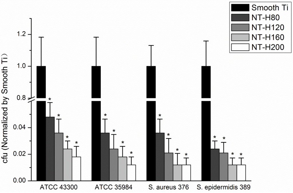 The number of viable bacteria adhered on Smooth Ti and NT-H surfaces at 6 h. The number of viable bacteria was counted and normalized to the counts from the Smooth Ti control for each bacterial strain. * denotes a significant difference compared to Smooth Ti (P < 0.01).