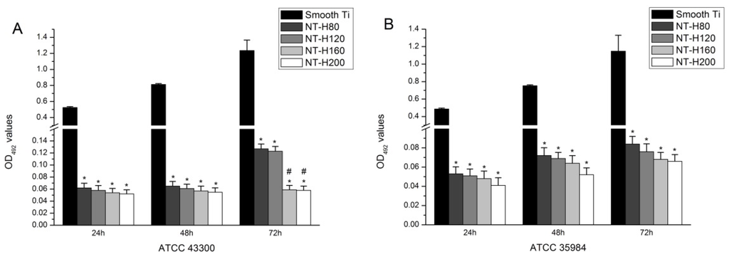 Bacterial adhesion on Smooth Ti and NT-H with different diameters was investigated by the spread plate method, which has been described elsewhere [39,40]. The inocula of the four strains were re-suspended to a final density of 1 × 106 colony forming units (CFUs)/mL in TSB using McFarland standards. The Smooth Ti and different-diameter NT-H disks was incubated with 1 mL of the suspension in a 48-well plate at 37 °C with agitation at 100 rpm for 6 h. Then, the specimens were removed with sterile forceps, placed into a fresh 48-well plate and gently washed with sterile PBS three times to remove loosely-adherent bacteria. The specimens were then placed in 0.5 mL of TSB, and the adherent bacteria on the discs were dislodged by ultrasonication (5 min) in a 150 W ultrasonic bath (B3500S-MT, Branson Ultrasonics Co., Shanghai, China) operating at a frequency of 50 Hz. The ultrasonication was followed by rapid vortex mixing (Vortex Genie 2, Scientific Industries, Bohemia, NY, USA) at maximum power for 1 min to remove bacteria that had adhered to the surfaces. This method is known to be effective for removing biomaterial-adherent bacteria [41,42]. The vortexed solutions were plated in triplicate onto TSA and then incubated at 37 °C for 24 h. The number of CFUs on the TSA was counted, the amount of bacteria adhesion on the substrates was calculated, and is expressed relative to the surface area of the sample (CFUs/mm2).