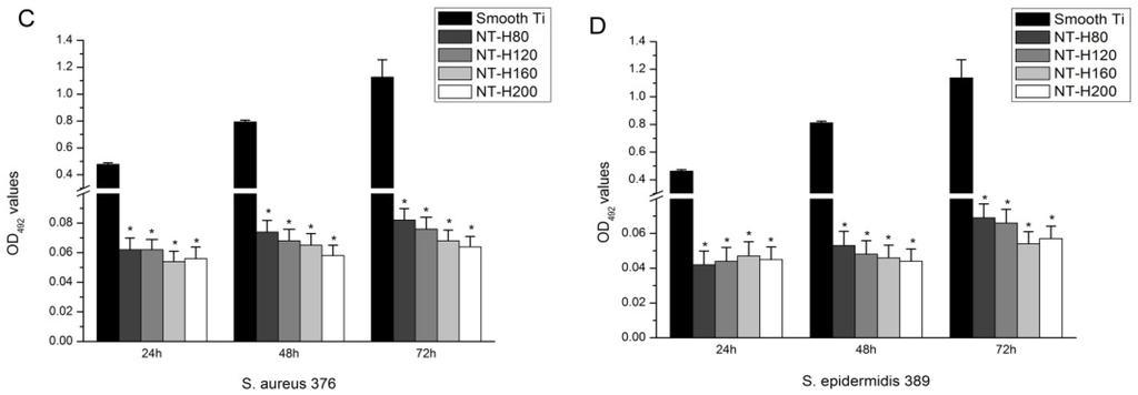 The initial adhesion of bacteria to biomaterial surfaces is the critical event for the pathogenesis of foreign body infections [52]. Reducing bacterial adhesion during the initial 6 h period following implantation is particularly important to avoid implant-associated infection [53]. It has been suggested that if the antibiotics or other antibacterial agents are able to prevent initial bacterial adherence to surfaces, the subsequent step of biofilm formation would also be inhibited [54]. Therefore, an effective measure to combat the implant-associated infection is to inhibit bacterial adhesion prior to biofilm formation. We can observe in Table 1 that an initial burst of release in all four groups of NT-H with different diameters. The high initial concentrations of released HACC would efficiently kill planktonic bacteria to inhibit bacterial adhesion on the nanotubes surface and the total amounts of HACC released from NT-H80, NT-H120, NT-H160, and NT-H200 within 60 h were 741, 812, 1080, and 1178 µg, respectively, which were all above the MICs of each group of tested strains (64 µg/mL for ATCC 43300, 32 µg/mL for ATCC 35984, 32 µg/mL for S. aureus 376, and 32 µg/mL for S. epidermidis 389). As described previously, the spread plate method, tissue culture plate, CLSM, and SEM were used to investigate the ability of NT-H with different diameters to prevent bacterial adhesion and biofilm formation for four tested strains, ATCC 43300, ATCC 35984, S. aureus 376, and S. epidermidis 389. Our results demonstrated that for all four tested strains, including MRSA, all groups of NT-H could significantly inhibit the bacterial adhesion, and there was no biofilm formation on the NT-H surfaces at different time points. Compared with the NT-H, there were far more bacteria adhered to the surface of Smooth Ti at the 6 h time point and formed obvious biofilm at the 24, 48, and 72 h time points for all tested strains.