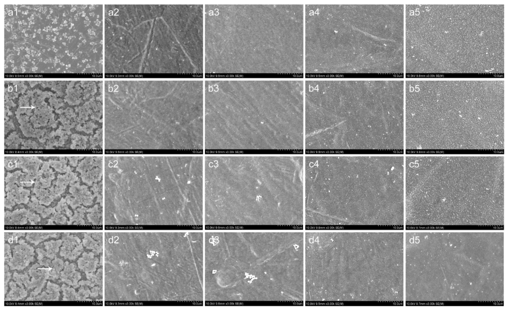 SEM images of ATCC 43300 adhesion and biofilm formation on different surfaces. (1) Smooth Ti; (2) NT-H80; (3) NT-H120; (4) NT-H160; (5) NT-H200 after (a) 6 h; (b) 24 h; (c) 48 h; and (d) 72 h incubation. Arrow head indicates the bacteria colony in biofilm. The magnification level is ×3,000. The scale bar is 10 µm.
