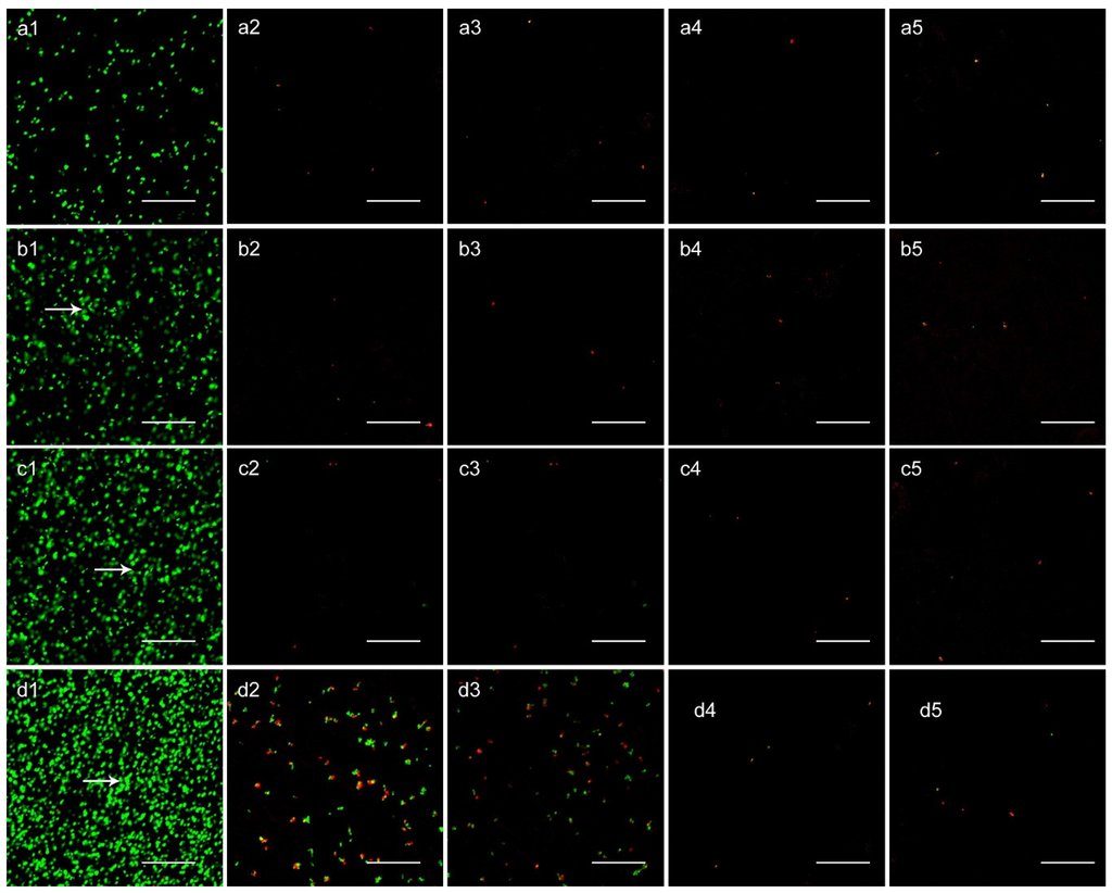 As shown in Figure 5, there were a few single bacterial colonies scattered on the surfaces of NT-H80 and NT-H120 at the 6, 24, and 48 h time points (a2, b2, c2, a3, b3, c3) and on the surfaces of NT-H160 and NT-H200 at the four time points (a4, b4, c4, d4, a5, b5, c5, d5). The colonies on the NT-H80 and NT-H120 surfaces were more obvious than those on NT-H160 and NT-H200 at the 72 h time point. In contrast, it could be observed that many multiple bacterial colonies adhered to the surfaces of the Smooth Ti at the 6 h time point (a1) and formed biofilm with a multilayer structure at the 24, 48, and 72 h time points (b1, c1, d1). In Figure 6, we could observe that an intense fluorescence on the surface of the Smooth Ti at the 24, 48, and 72 h time points (b1, c1, d1), which indicated that significant biofilm formation. The bacterial colonies were sparsely distributed on the surface of NT-H at different time points, which indicates no biofilm formation. Similar to the results of SEM observation, there were fewer bacterial colonies on the surfaces of NT-H160 and NT-H200 compared to those of NT-H80 and NT120 at the 72 h time point (d2, d3, d4, d5).