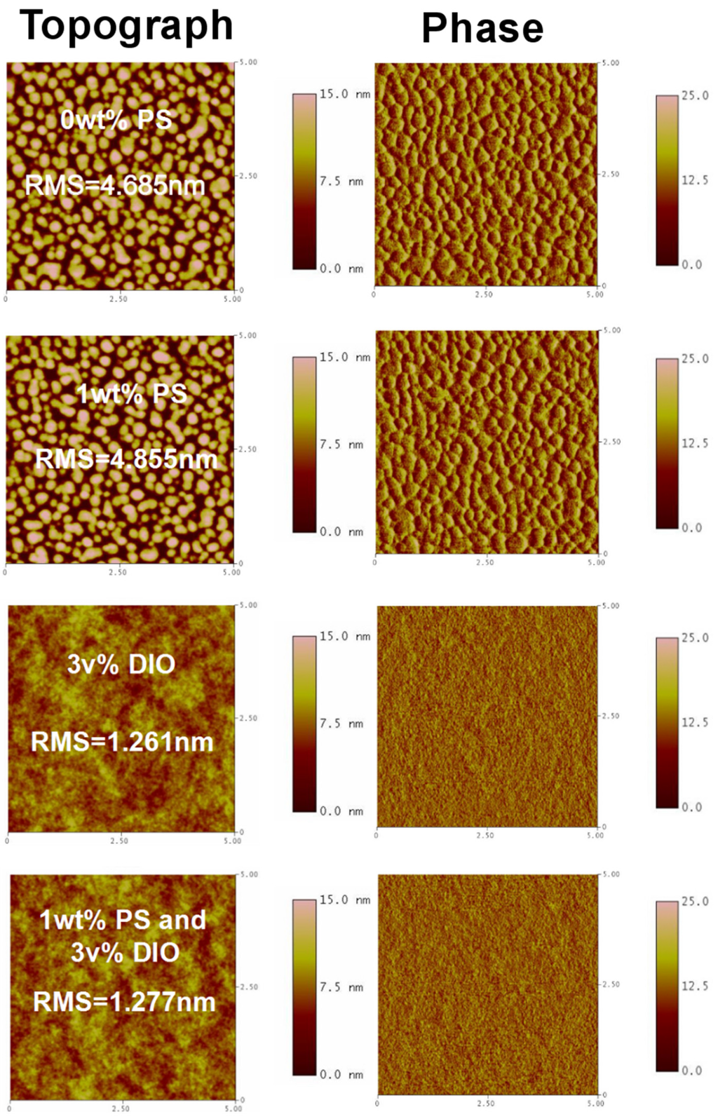 The AFM surface topography and phase images of the PTB7:PC71BM films with/without 3 v% DIO and/or 1 wt % PS.