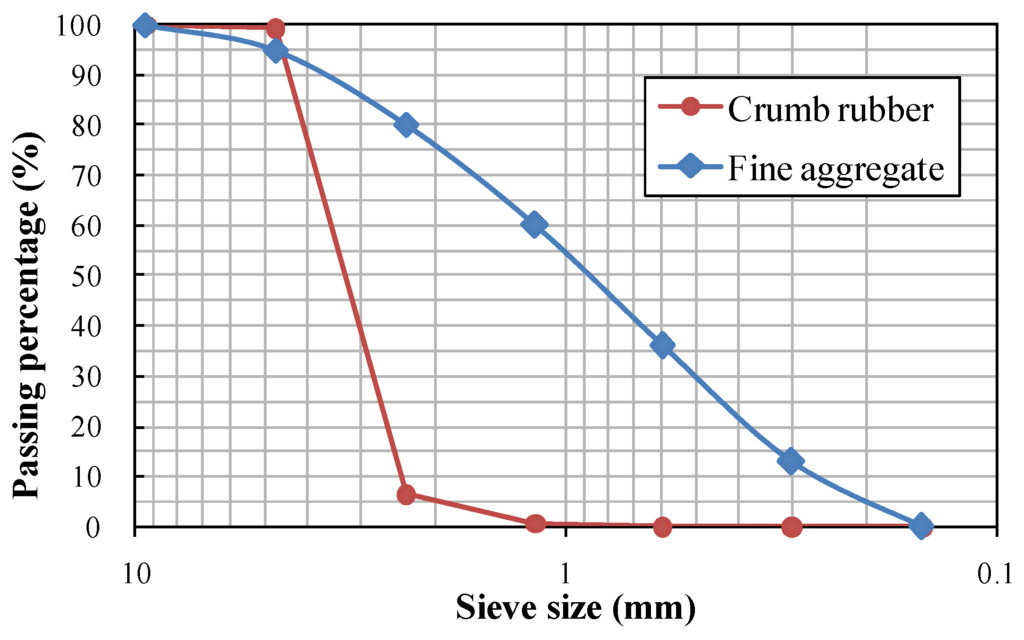Particle size distribution of fine aggregate and crumb rubber.