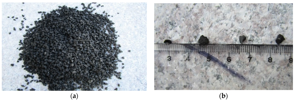 Crumb rubber with a size of 2–4 mm. (a) Crumb rubber; (b) particle size.