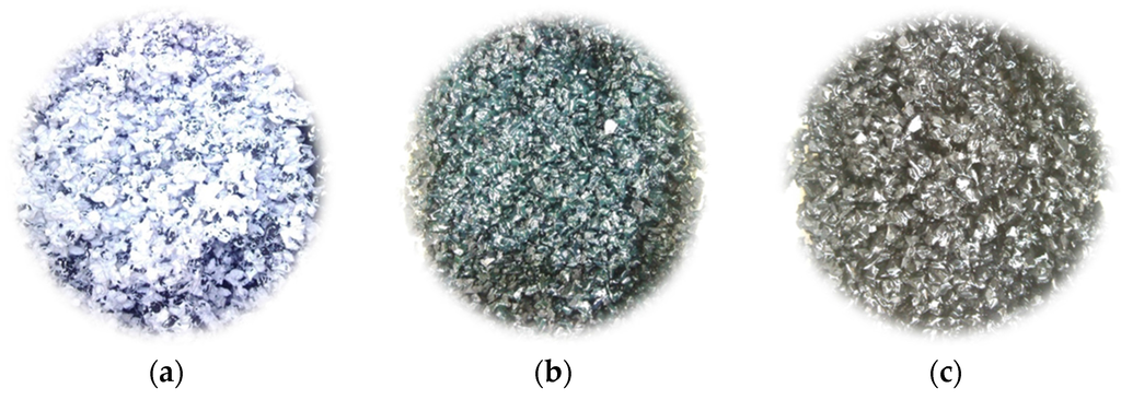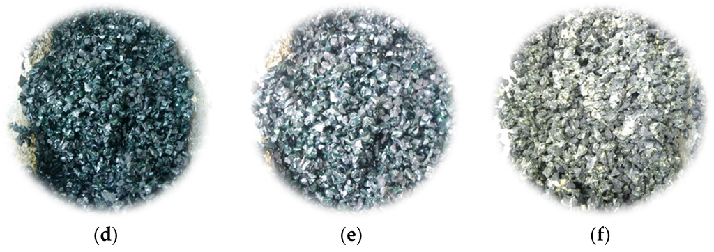 Modifiers for the pretreatment of crumb rubber, including emulsion, ethoxyline resin, synthetic resin, amino-acrylate (contact glue), chloroprene adhesive and unsaturated resins (marble glue), were commonly used in decoration and construction engineering. They had satisfactory performance in improving adhesion and enhancing strength. The crumb rubbers after pretreatment by modifiers are shown in Figure 3.