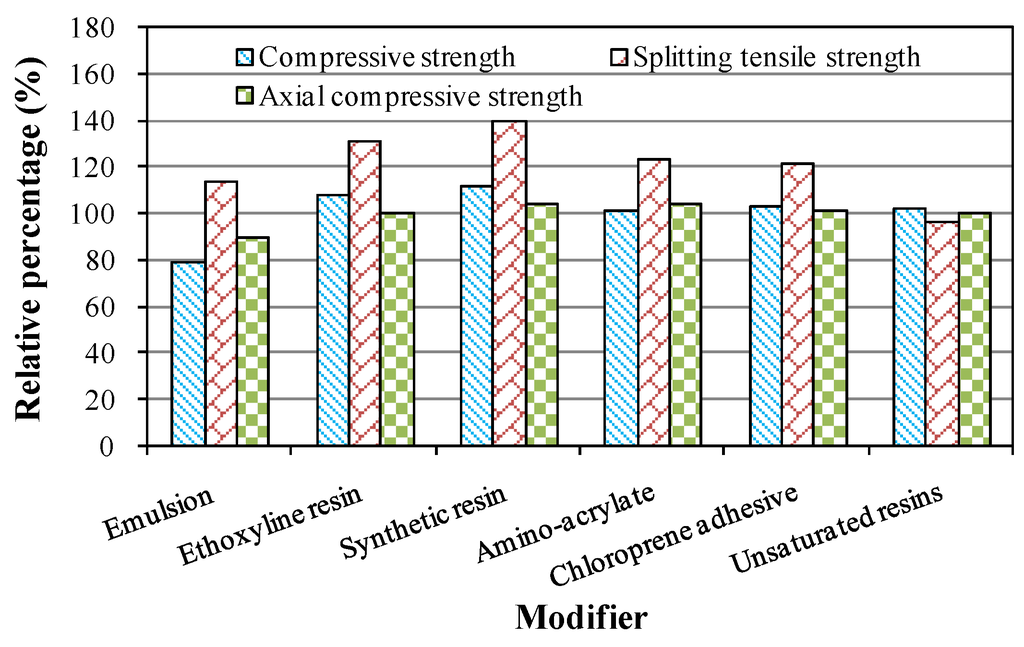 Modified crumb rubber concrete was produced by introducing crumb rubber after pretreatment using modifiers. Compressive strength, splitting tensile strength and axial compressive strength were tested. Compared to the measured strength of unmodified crumb rubber concrete, the percentage was calculated, and corresponding results are listed in Table 4. Moreover, the effect of six pretreatment methods on the mechanical properties is illustrated in Figure 8. As can be seen from Table 4 and Figure 8, the effects of modifiers on the mechanical properties were different from each other. The majority had a positive influence on enhancing the strength of crumb rubber concrete. However, the modifier of emulsion reduced the compressive strength and axial compressive strength to 79% and 90%, respectively. Unsaturated resins decreased the splitting tensile strength to 97%. These two modifiers caused negative effects on the improvement of the mechanical strength of crumb rubber concrete. It had been found that the pretreatment using synthetic resin significantly increased the strength as compared to other modifiers. The compressive strength, splitting tensile strength and axial compressive strength of crumb rubber concrete prepared with pretreated rubber using synthetic resin increased 12%, 40% and 5%, respectively, as compared to the untreated rubber. Therefore, the modifier of synthetic resin could be accepted to increase the mechanical strength of crumb rubber concrete.