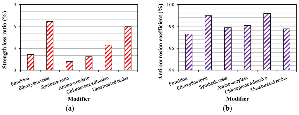 The effect of pretreatment methods on freezing-thawing resistance and sulfate resistance was investigated. Additionally, the testing results are listed in Table 5. Figure 9 reports the difference in the durability of crumb rubber concrete modified by six modifiers. It was indicated that the anti-corrosion coefficients of crumb rubber concrete modified by six modifiers were all larger than 97%, which indicated that the pretreatments for the crumb rubber improved the ability of crumb rubber concrete to resist sulfate corrosion. Ethoxyline resin and chloroprene adhesive enhanced the resistance against sulfate corrosion more significantly with anti-corrosion coefficients of 99.0% and 99.2%, respectively. As for the freezing-thawing resistance, the strength loss ratios of crumb rubber concrete modified by ethoxyline resin and unsaturated resins were larger than 5%, which indicated that the ability of resisting freezing-thawing was not acceptable. Synthetic resin significantly reduced the strength loss ratio to 1.2%, which obviously improved the performance of freezing-thawing resistance. Due to the similar effect of pretreatment methods on sulfate resistance, the optimal modifier was selected based on the improvement of the freezing-thawing resistance. Therefore, synthetic resin was selected as the optimal modifier because of excellent freezing-thawing resistance and acceptable sulfate resistance.