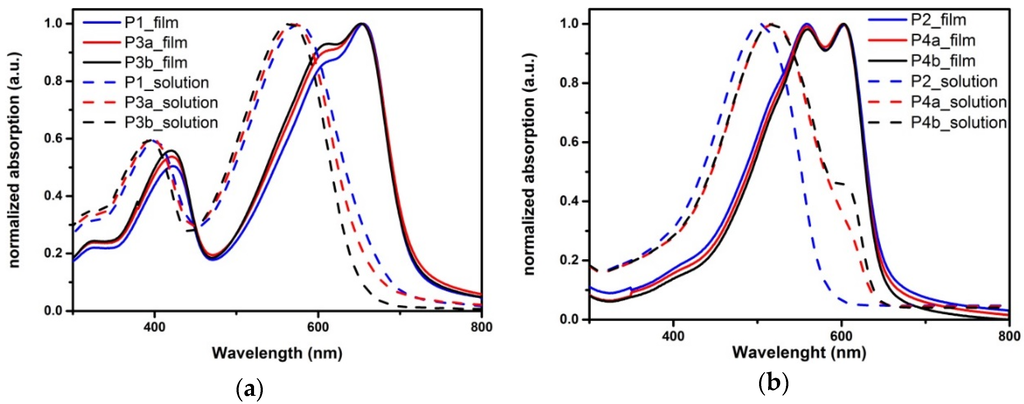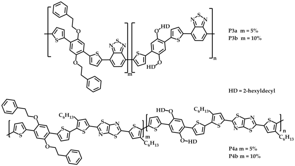 - Carlé, J.E.; Andreasen, J.W.; Jørgensen, M.; Krebs, F.C. Low band gap polymers based on 1,4-dialkoxybenzene, thiophene, bithiophene donors and the benzothiadiazole acceptor. Sol. Energy Mater. Sol. Cells 2010, 94, 774–780. [Google Scholar] [CrossRef]