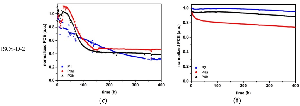 - Kesters, J.; Kudret, S.; Bertho, S.; van den Brande, N.; Defour, M.; van Mele, B.; Penxten, H.; Lutsen, L.; Manca, J.; Vanderzande, D.; et al. Enhanced intrinsic stability of the bulk heterojunction active layer blend of polymer solar cells by varying the polymer side chain pattern. Org. Electron. 2014, 15, 549–562. [Google Scholar] [CrossRef]