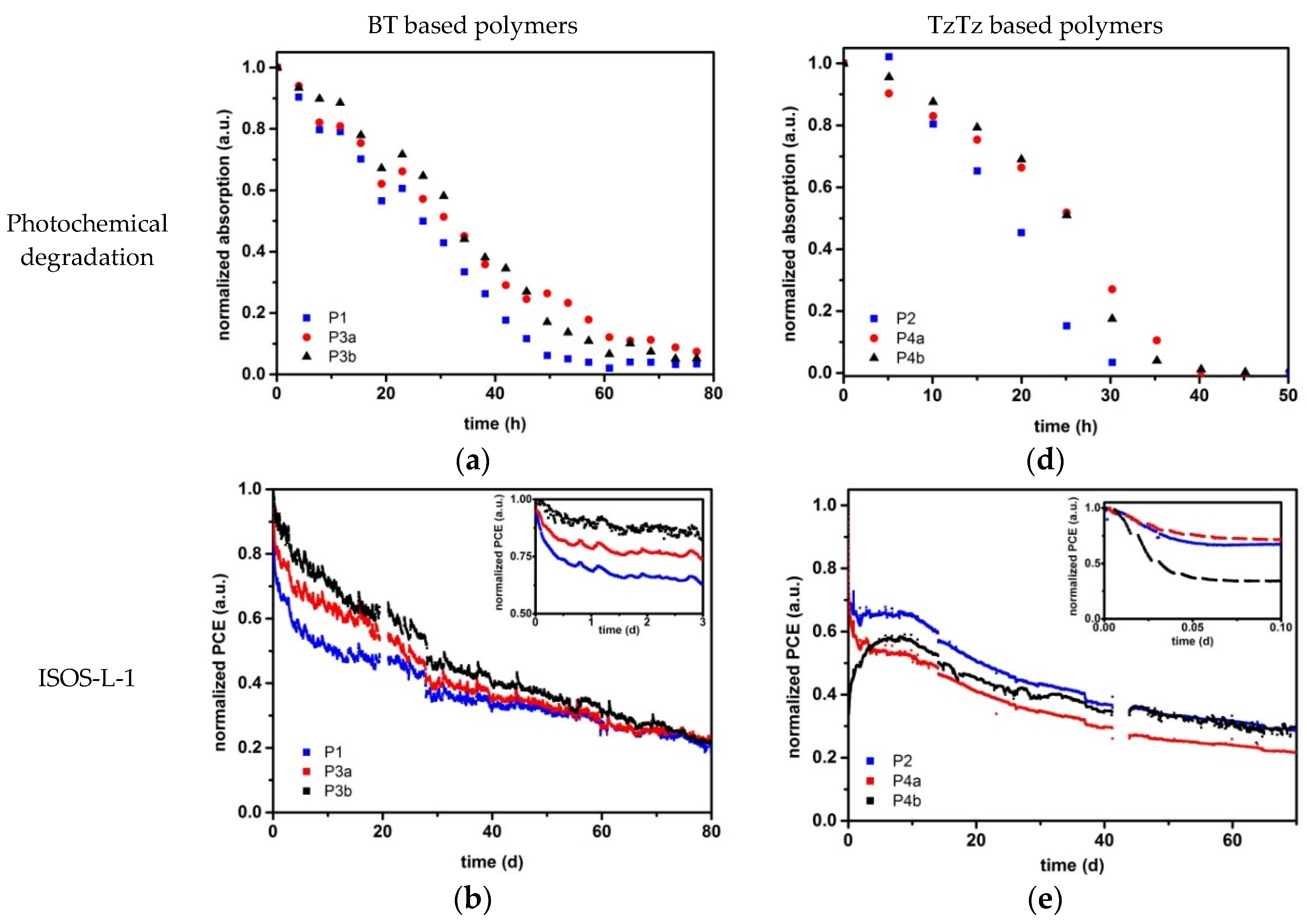- Tromholt, T.; Madsen, M.V.; Carlé, J.E.; Helgesen, M.; Krebs, F.C. Photochemical stability of conjugated polymers, electron acceptors and blends for polymer solar cells resolved in terms of film thickness and absorbance. J. Mater. Chem. 2012, 22, 7592–7601. [Google Scholar] [CrossRef]