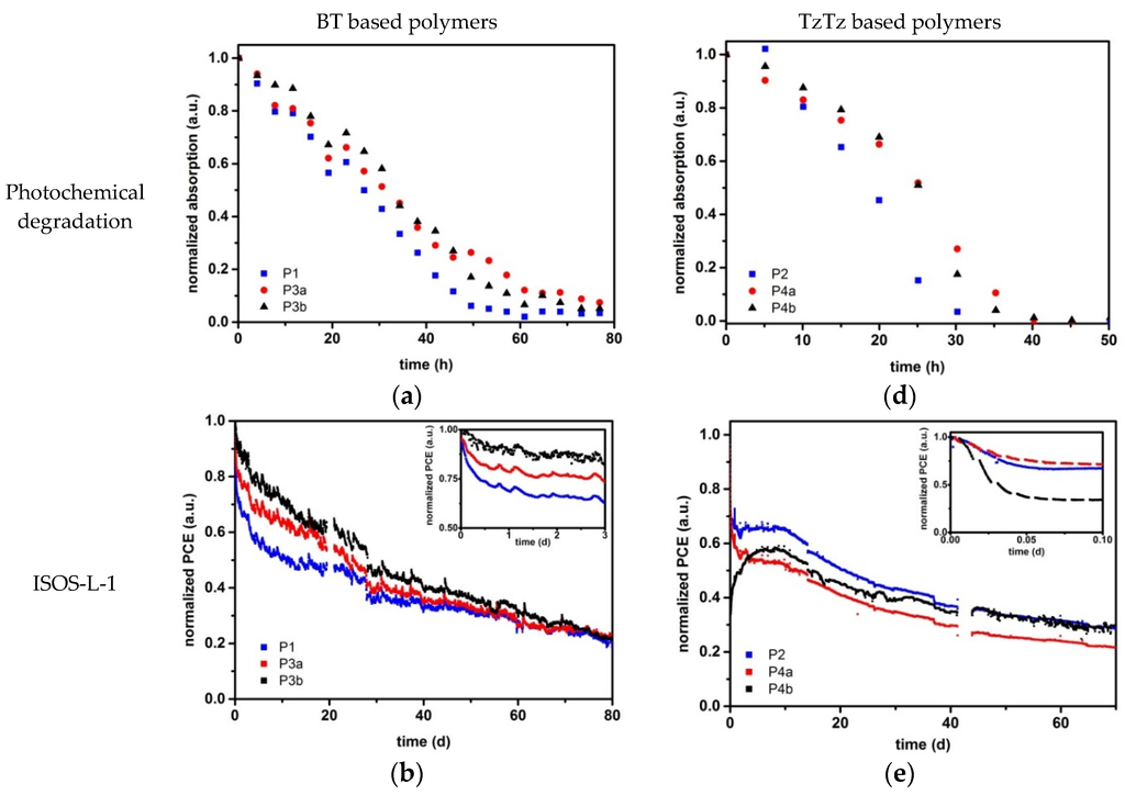 Maximum values of the normalized UV-VIS absorption of the polymer films as a function of time during sun irradiance (a,d), average lifetime measurements (ISOS-L-1 [35]) of the polymer solar cells (PSCs) normalized in terms of PCE (b,e) and the thermal degradation test (ISOS-D-2 [35]) of the PSCs normalized in terms of PCE (c,f) for the BT- (a–c) and TzTz- (d–f) based polymer series.