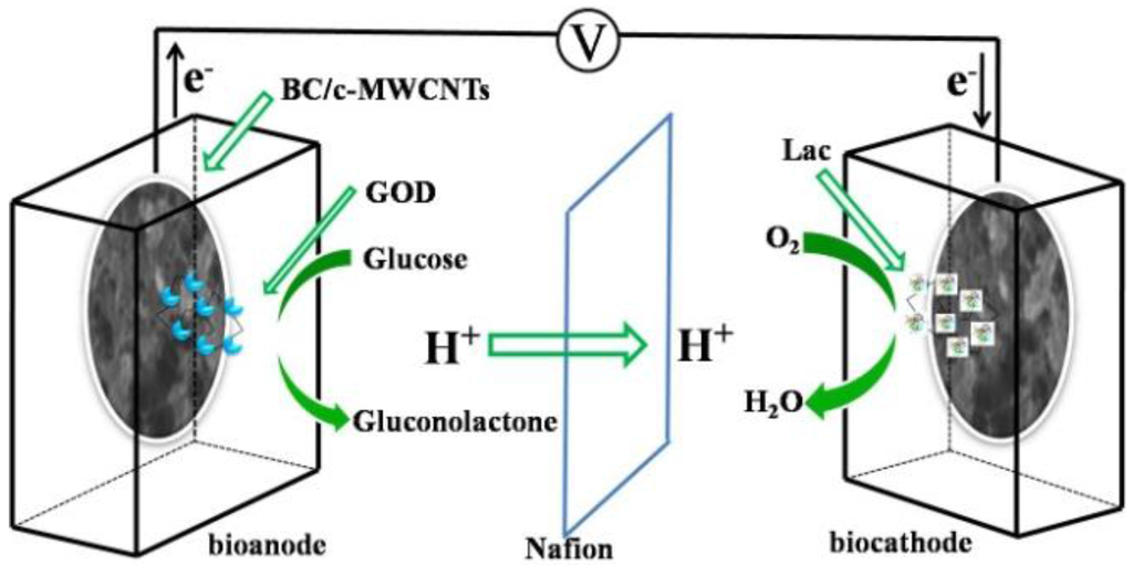 The biocathode was prepared by the following method: BC/c-MWCNTs were injected by 40 mg mL−1 Lac with 1.5% (v/v) GA in 0.1 M acetic acid/sodium acetate buffer (pH = 5.5) solution for 1 h. The bioanode was prepared by similar method except that the 40 mg mL−1 Lac was replaced by 20 mg mL−1 GOD. Then, the electrode was dipped into 0.1 M acetic acid/sodium acetate buffer (pH = 5.5) solution containing 50 mM glucose, as shown in Figure 2.
