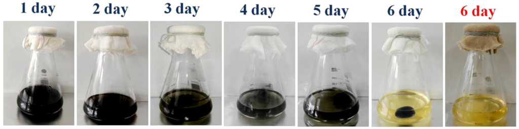 Figure 3 illustrates a six-day track of bacterial cellulose growth in presence of c-MWCNTs under agitated culture. Firstly, G. xylinus was inoculated into the culture media contain c-MWCNTs. On the first day, culture solution fully presented black color as shown in Figure 3, but it could be seen that the color faded with the increasing number of days, revealing only a single black bacterial cellulose in the culture solution indicating the incorporation of c-MWCNTs into the bacterial cellulose. On the sixth day, the culture solution became clearer (similar to the original culture color), indicating the incorporation of remaining c-MWCNTs into BC pallet. The sixth day growth of bacterial cellulose in the absence of c-WMCNTs presented a white cryptomere structure.