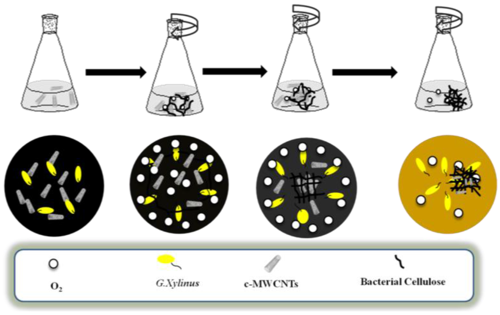 Figure 4 displays schematic illustration of the formation of bacterial cellulose and the integration of c-MWCNTs into the 3D interconnected fibrous network of BC. Firstly, c-MWCNTs were dispersed into culture solution and then the free bacteria was attached to the surface bubbles which apparently underwent reproduction to synthesize bacterial cellulose fibers [24]. As the days increased, the bacterial cellulose attached itself to the c-MWCNTs to form a more compact structure [25]. Due to the growth of the bacterial cellulose in the presence of c-MWCNTs under agitated conditions, the bacterial cellulose and c-MWCNTs entangled with each other and gradually gathered for the dispersion of c-MWCNTs in culture solution. It was again observed that due to the slow rate of BC-formation, c-MWCNTs was, therefore, absorbed on the BC whiles the bacteria gathered around the BC/c-MWCNTs composite and produced BC fibrils. The formation of new BC fibrils on existing composite was continuous until a more compact, irregularly shaped, and randomly overlapped composite was obtained.
