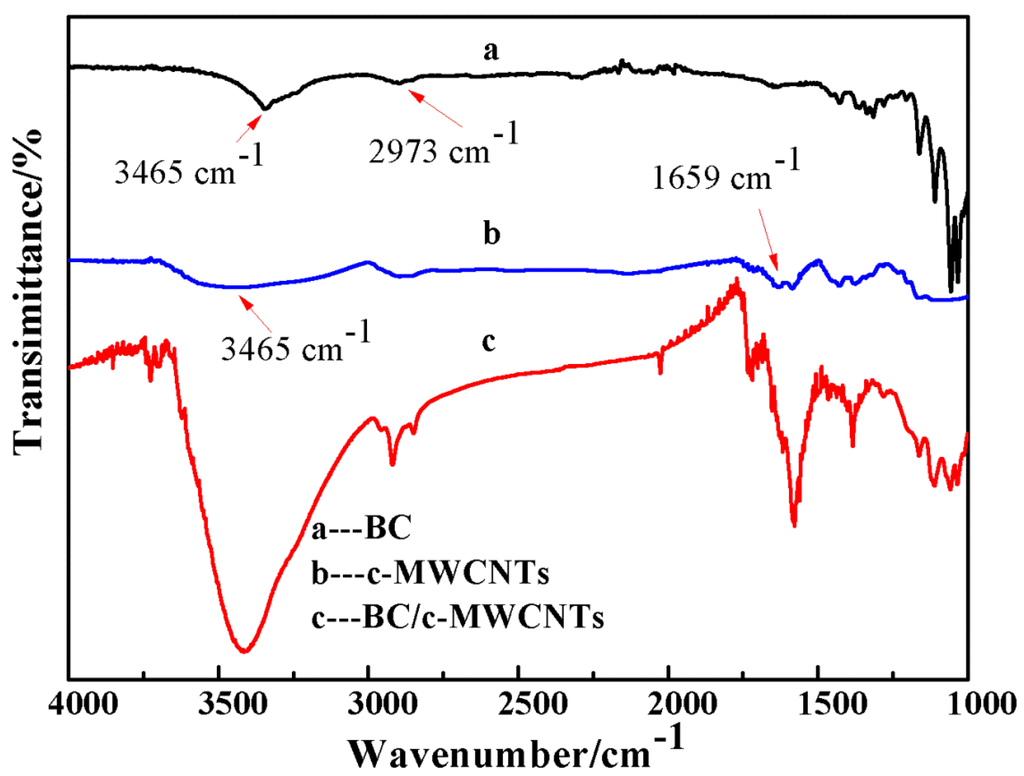 FTIR spectra of different composite. (a) BC; (b) c-MWCNTs; and (c) BC/c-MWCNTs composite.