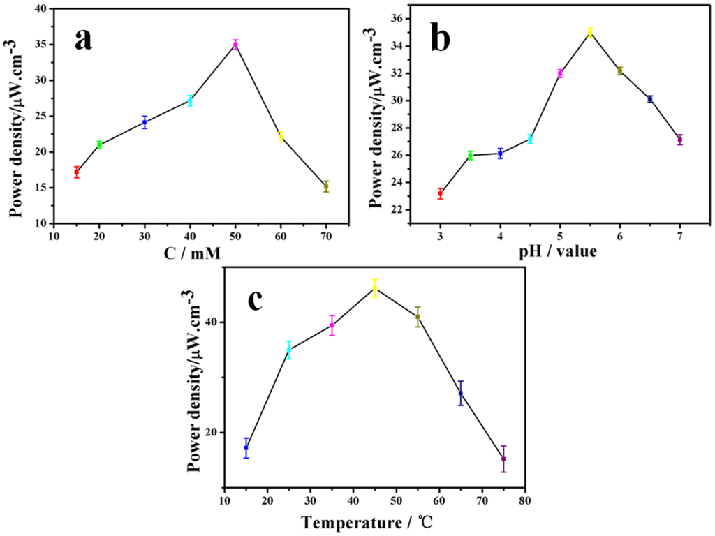 The maximum power output of the EBFC with different conditions: (a) glucose concentrations; (b) optimum pH; and (c) optimum temperature.