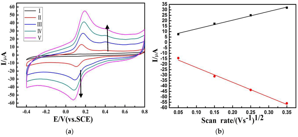 As shown in Figure 8a, the CVs of the BC/c-MWCNTs/Lac electrode were absent, whereas a pair of prominent redox peaks (at 0.74 V and 0.11 V, respectively) can be observed [32], which was attributed to the redox reaction of the Lac immobilized on the c-MWCNTs. This showed the good coupling between the enzymes and 3D BC/c-MWCNTs substrate. The redox of Lac on the electrode was a reversible and surface-confined process, which could be demonstrated by the linear relationship between redox currents and scan rate, as shown in Figure 8b. The bare 3D BC/c-MWCNTs electrode showed no catalytic action to O2 in comparison with that of BC/c-MWCNTs/Lac electrode.