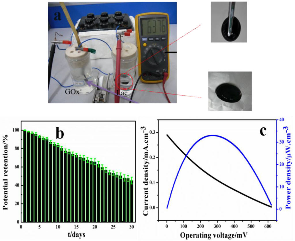 (a) The maximum open circuit voltage of the EBFCs; (b) The open circuit voltage from the EBFCs over 30 days; and (c) The power density curve of glucose/O2 biofuel cell obtained by LSV in 0.1 m, pH 5.5, HAc/NaAc buffer containing 50 mM glucose, data were collected at 10 mV s−1.