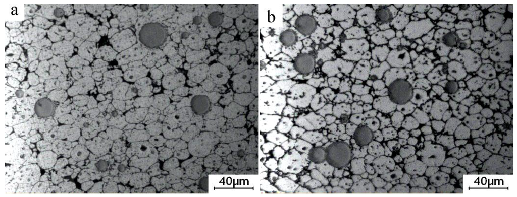 Figure 6 depicts the microstructure of the bulk alloy heated at 640 °C for over 15 min. Large particles are distributed over the whole structure (Figure 6a), and all the particles are separated only by a thin liquid film (Figure 4c). As the heating time increases, the microstructures are found to consist of small and large particles. The number of the small particles increases with time, while the number of the large particles decreases (comparing Figure 6a–c). It can be suggested that the amount of the liquid phase around the primary particles continuously increases because the primary particles are further partially remelted due to the temperature rising (Figure 5). The liquid phase solidifies into the secondary primary α-Al phase and eutectics during the water quenching. However, the solidification of the liquid phase is very rapid during quenching, so the secondary primary solidified particles are relatively smaller than the primary α-Al particles. Thus, the relatively small particles in the quenched microstructure originate from the solidification of the liquid phase. Figure 7 shows the microstructure of the bulk alloy with a full-liquid 2024 alloy matrix (the bulk alloy was heated for 60 min at 750 °C) after being water-quenched. It shows that this microstructure is composed of small particles and intergranular eutectics. The quantitative examination results indicate that the size of the small particles is about 6 μm. Therefore, the particles less than 6 μm in size can be regarded as a liquid phase. From this standpoint, Figure 6c clearly shows that the liquid phase (marked by circles in the Figure 6c) is evenly distributed between the particles. Moreover, the shapes of the primary particles in the present microstructure are always spherical because the shapes of the initial particles are also spherical. A slight coarsening of the spherical primary particles occurs in order to decrease the solid/liquid interfacial energy, which is the main event during this stage (Figure 8). As the heating time further increases, the solid-liquid two-phase system achieves a dynamic equilibrium when the liquid amount is maintained at a constant value. However, the shape of the primary particles becomes slightly irregular after heating for 210 min (Figure 6d). The diffusion reaction between Al and Ti may be suggested to have an influence on the microstructural evolution of the matrix alloy.