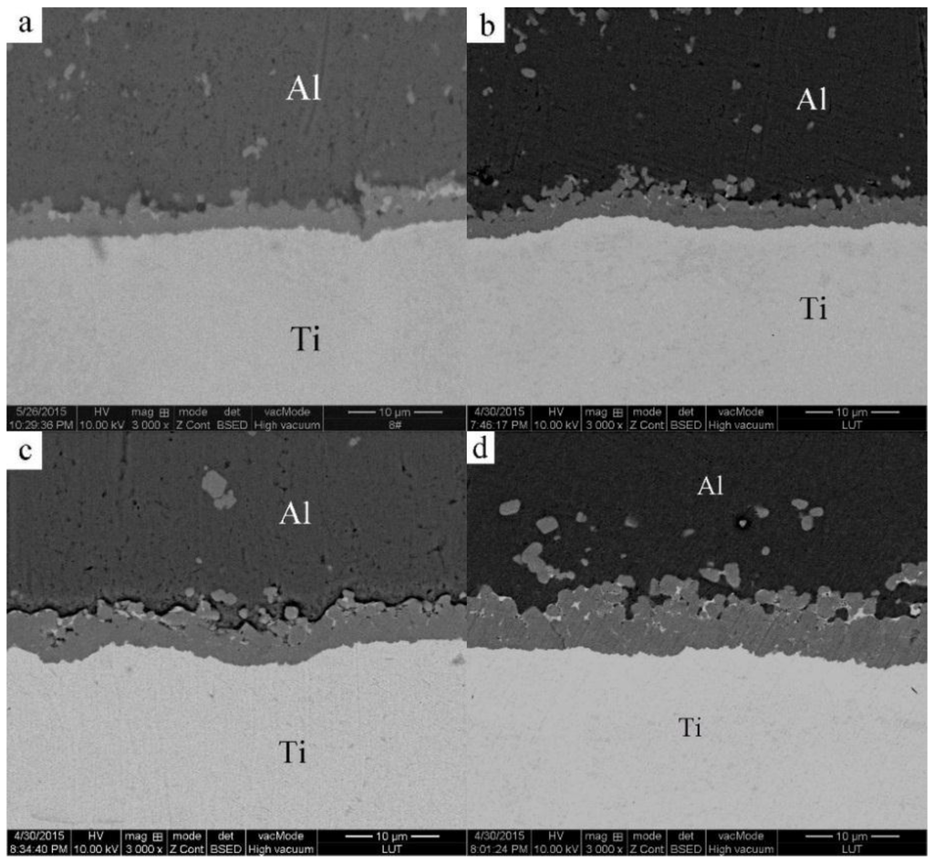 To study the evolution and growth behavior of the Al/Ti interface microstructure, molten aluminum was dripped into a 10 mm × 10 mm pure titanium plate to form a sample. The sample was then placed inside a stainless crucible. The crucible with the sample was in turn placed into a vacuum furnace and reheated at a semisolid temperature of the 2024 aluminum alloy (640 °C) for 1, 2, 3, 5, and 8 h. After the sample was treated, ground, and polished, the bonding situations and microstructures were observed under a scanning electron microscope.