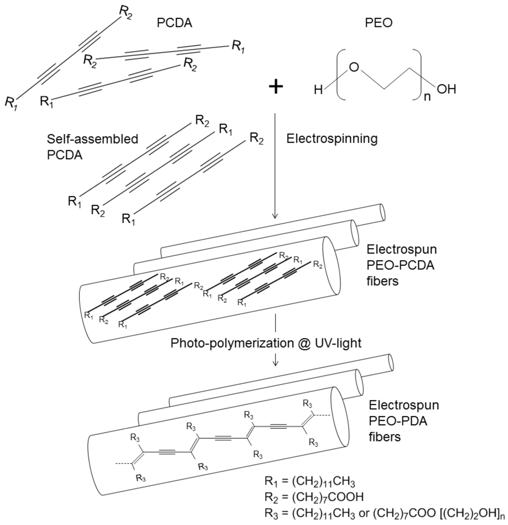 Schematic representation of the electrospinning of poly (ethylene oxide) (PEO) -Polydiacetylene (PDA) composite fibers.