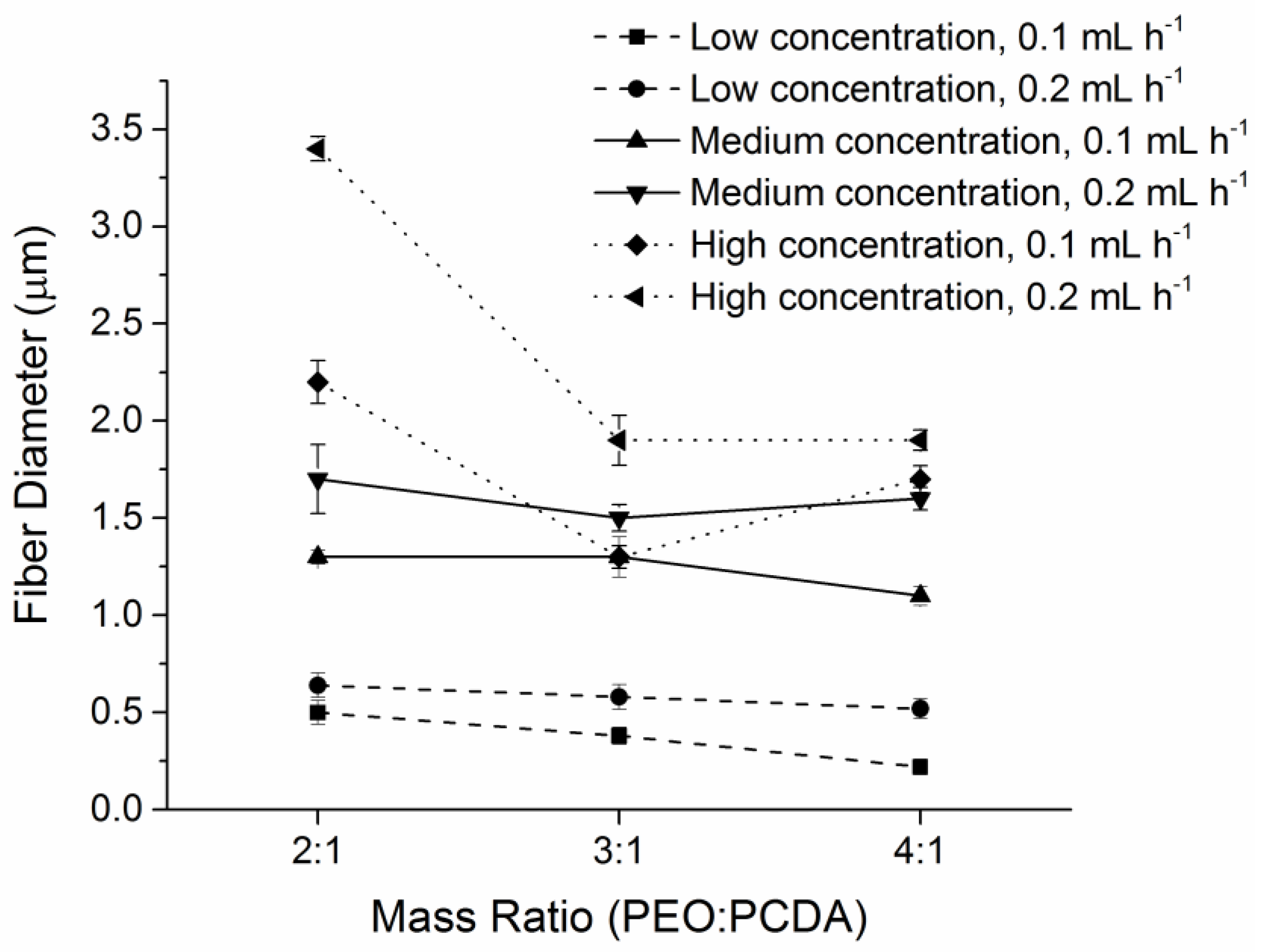 Fiber diameters are illustrated as a function of polymer concentration, mass ratios of PEO and PCDA, and injection speed. The injection speed used was 0.1 mL·h−1 (■, ▲ ♦) and 0.2 mL·h−1 (●, ▼, ◄), respectively. Finer fibers were formed at higher mass ratios, lower concentrations, and the lower injection speeds.