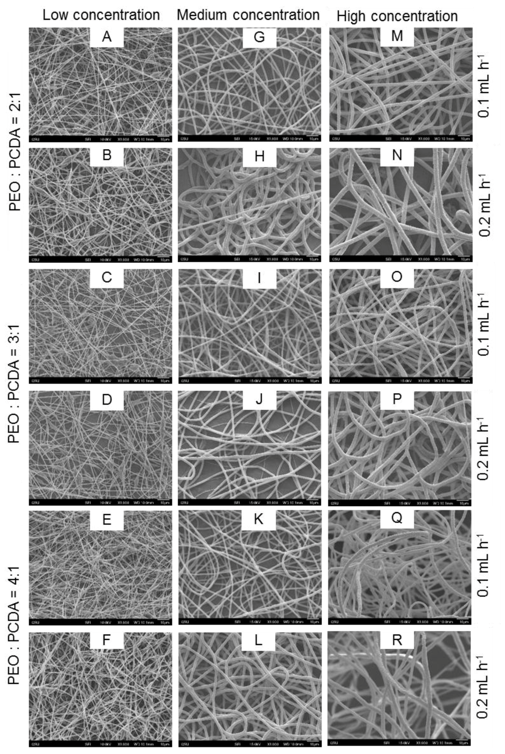 The surface roughness of the fibers was also varied depending on the electrospinning parameters. High mass ratio of PEO to PCDA promoted fibers with smooth surfaces possibly due to high fraction of PEO in the mixture solution that enhanced fiber formation. It was also found that the surface roughness of the PEO-PDA fibers increased with an increase in solution concentration and injection speed. In previous studies, surface roughness of electrospun fibers containing PDAs was reported to be varied when different solvents were used, including dimethylformamide, chloroform, and methylene chloride [18]. When a mixture of PCDA and poly (methyl methacrylate) (PMMA) in methylene chloride was electrospun, the obtained fibers exhibited porous structures on the surface [17].