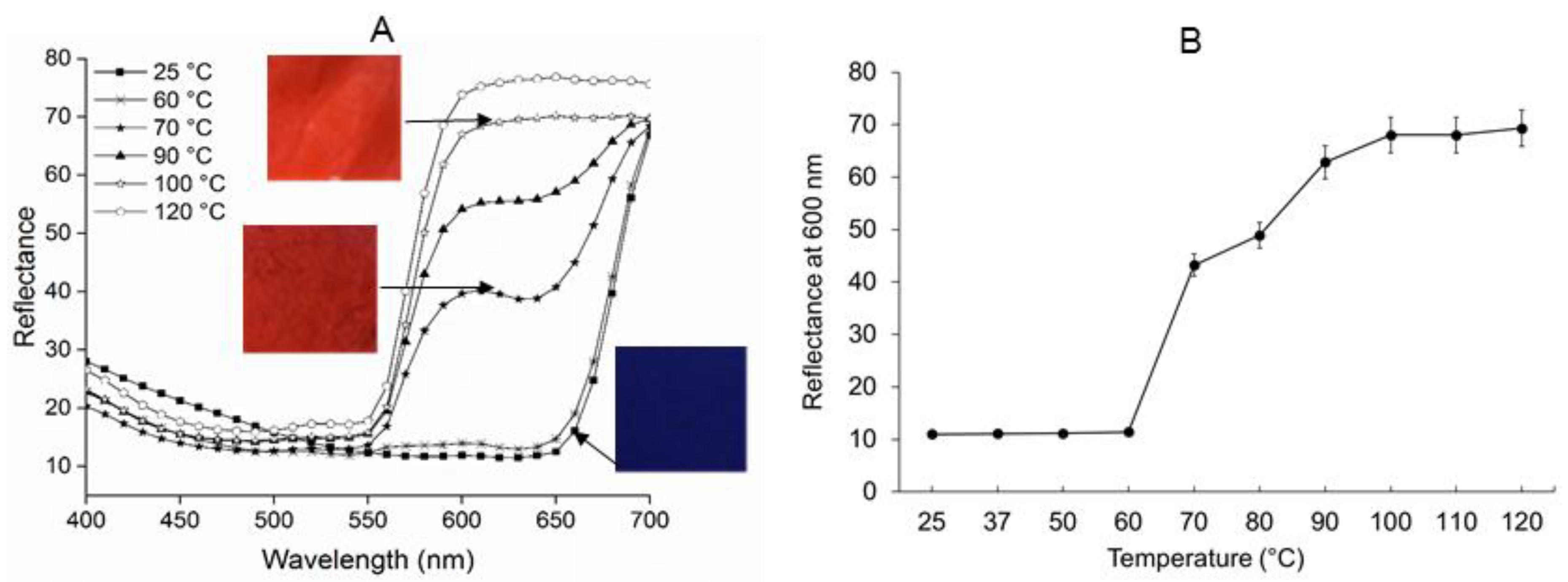 The fiber exhibited arising and high reflectance at 650 nm to 700 nm at low temperatures (37 °C and 50 °C) and a blue color in the corresponding photograph. When the heat treatment continued for the fiber, the fiber began to demonstrate a reflectance switch to a lower wavelength at 550 nm from 700 nm, resulting in a red color in the corresponding photograph. The reflectance switch was observed in all of the fibers studied in this work, but did not occur until the temperature was more than 60 °C for most of the fibers. It was much significant when the temperature reached 70 °C for all of the fibers (#1–#18). The observation that no blue-to-red switch occurred at low temperatures in the range of normal body temperature could exclude a false positive signal for biological sensing applications, such as bacterial infection.