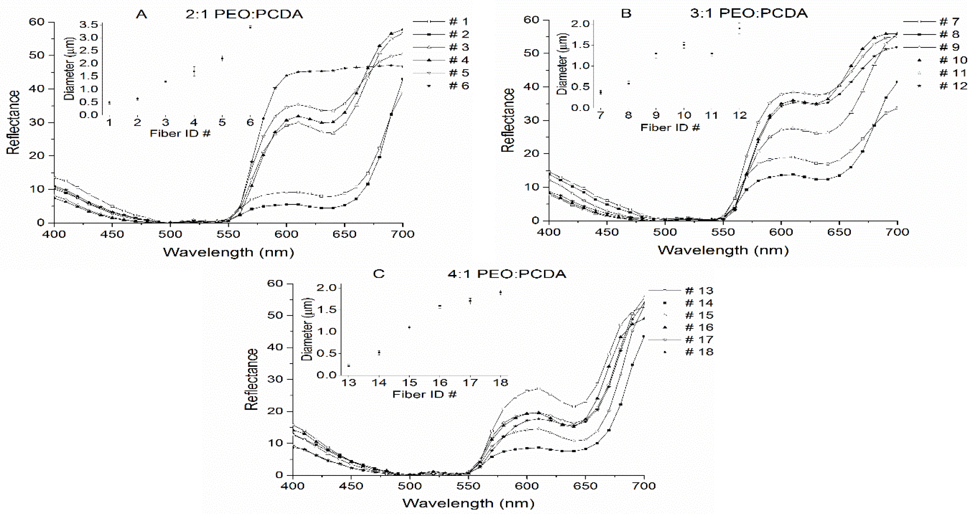 Normalized reflectance spectra of all the fibers heated at 70 °C are presented in Figure 5 where the diameters of the corresponding fibers are also inserted. The fibers with mass ratio of PEO to PCDA of 2:1 (see Figure 5A) clearly showed a more pronounced reflectance switch (color transition of blue to red) than the fibers with mass ratios of 3:1 and 4:1 (see Figure 5B,C). There was 33.33% PDA in the fiber composite with mass ratio of PEO to PCDA of 2:1. This high fraction of PDA in the fiber composite provided high sensitivity of color switch properties of the fiber. It is also interesting that that the reflectance switch was increasingly pronounced with an increase in fiber diameter, particularly for the fibers with 33.33% PDA (mass ratio of PEO to PCDA of 2:1) (see Figure 5A). Our early discussion on fiber size indicated that the polymer solution and injection speed influenced the fiber size, resulting in an order of fiber diameter as shown in the inserted plots in Figure 5A. The high reflectance associated with the coarse fibers was possibly due to high reflectance surface area. The reflectance switch, or color transition, continuously developed when the temperature was more than 70 °C, but no further change was found after the temperature was more than 110 °C, suggesting that an equilibrium was reached in the PDA macromolecule structure.