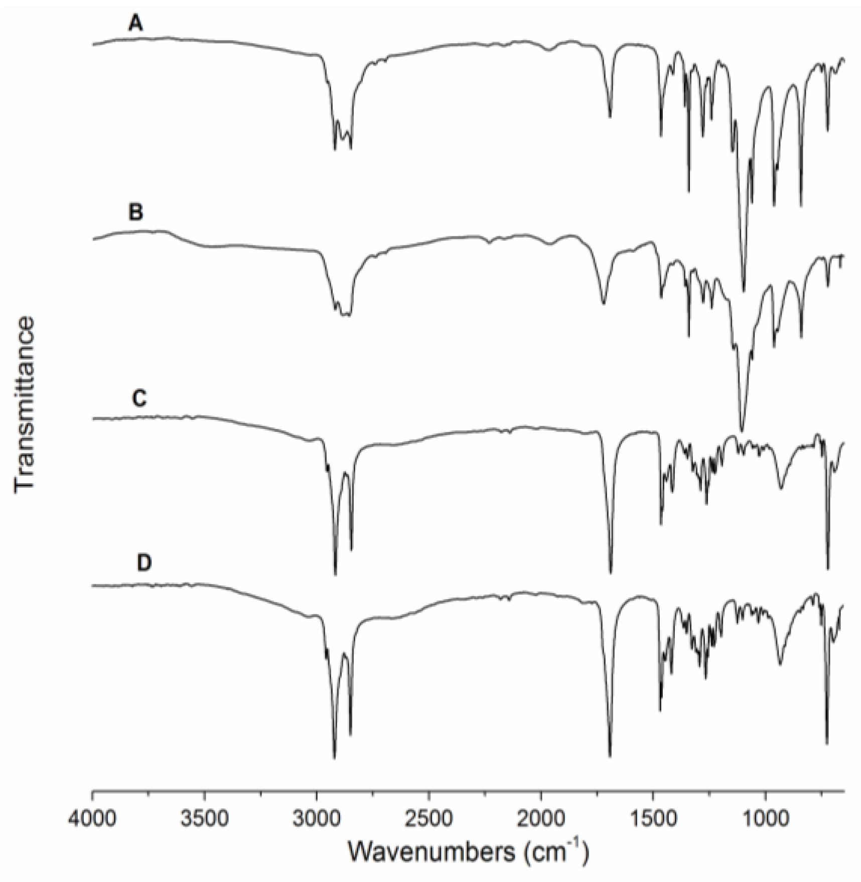 PDA was also synthesized in the absence of PEO and characterized by FTIR before and after the color transition (Figure 6C,D). Spectrum C represents the blue phase PDA where the following resonance features were observed: IR νmax cm−1: 2955 cm−1 (H-C=C), 2918–2847 cm−1 (H-C-H), 1690 cm−1 (C=O, ester), and 722 cm−1 (C=C). Spectroscopic data on spectrum D correspond to the red PDA: IR νmax cm−1: 2955 cm−1 (H-C=C), 2918–2847 cm−1 (H-C-H), 1690 cm−1 (C=O, ester), and 722 cm−1 (C=C).